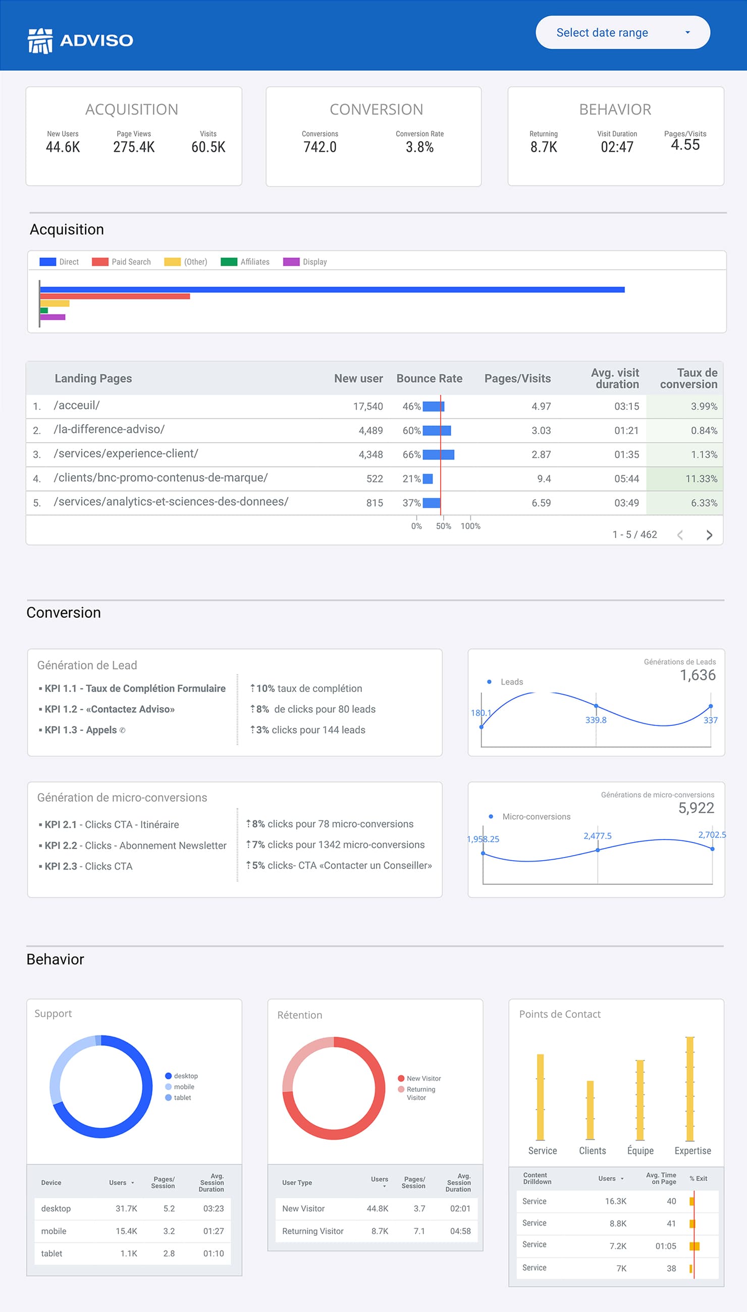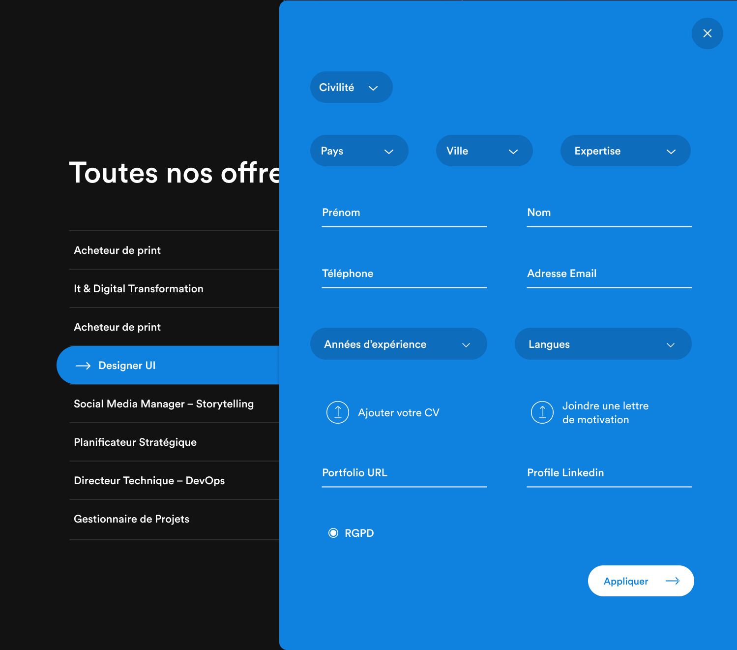 Un processus de design de composantes UI, de chartes graphiques cohérentes avec l’image de marque et d'interfaces web qui travaillent en synergie vers l’atteinte des objectifs client.