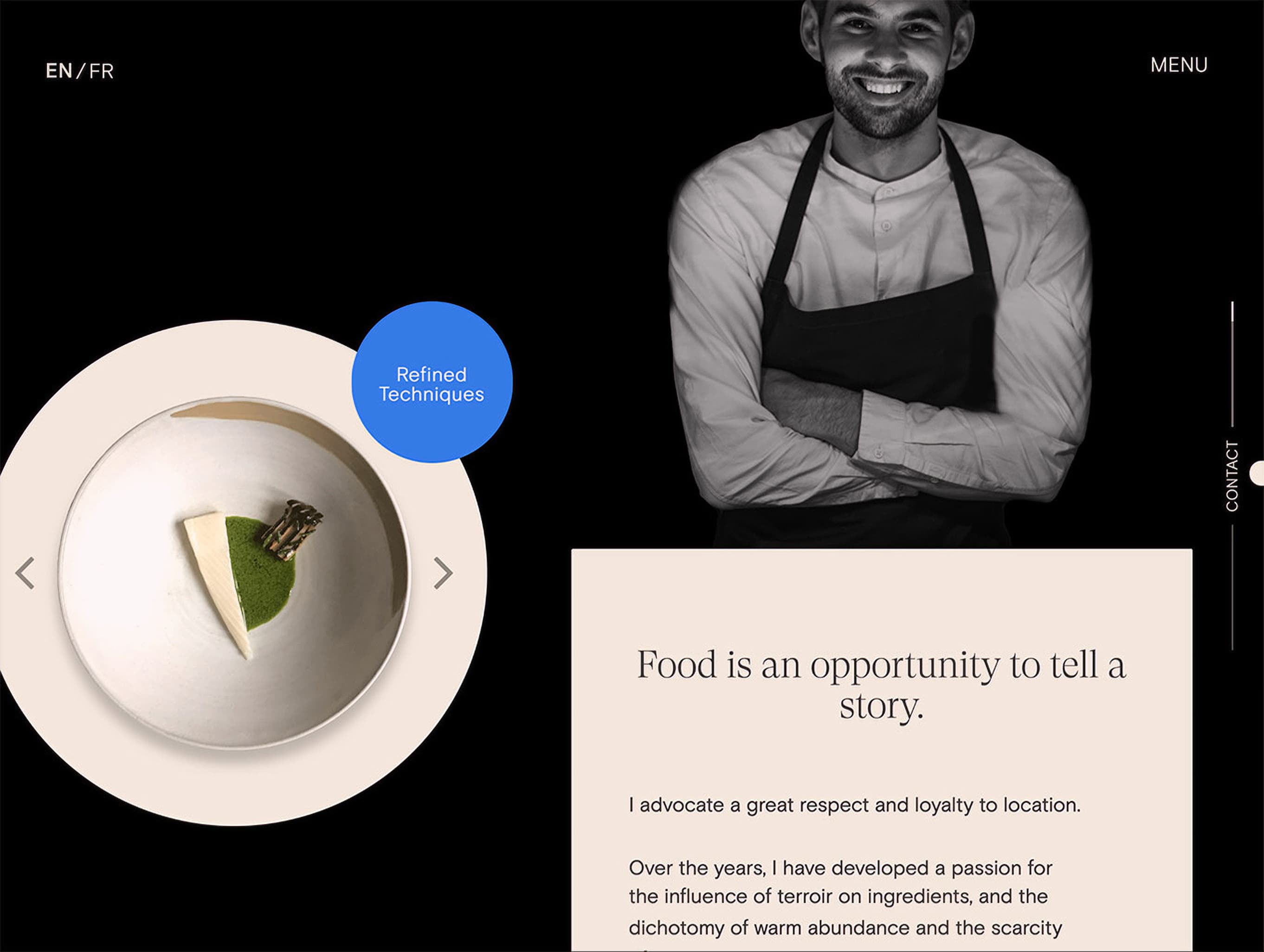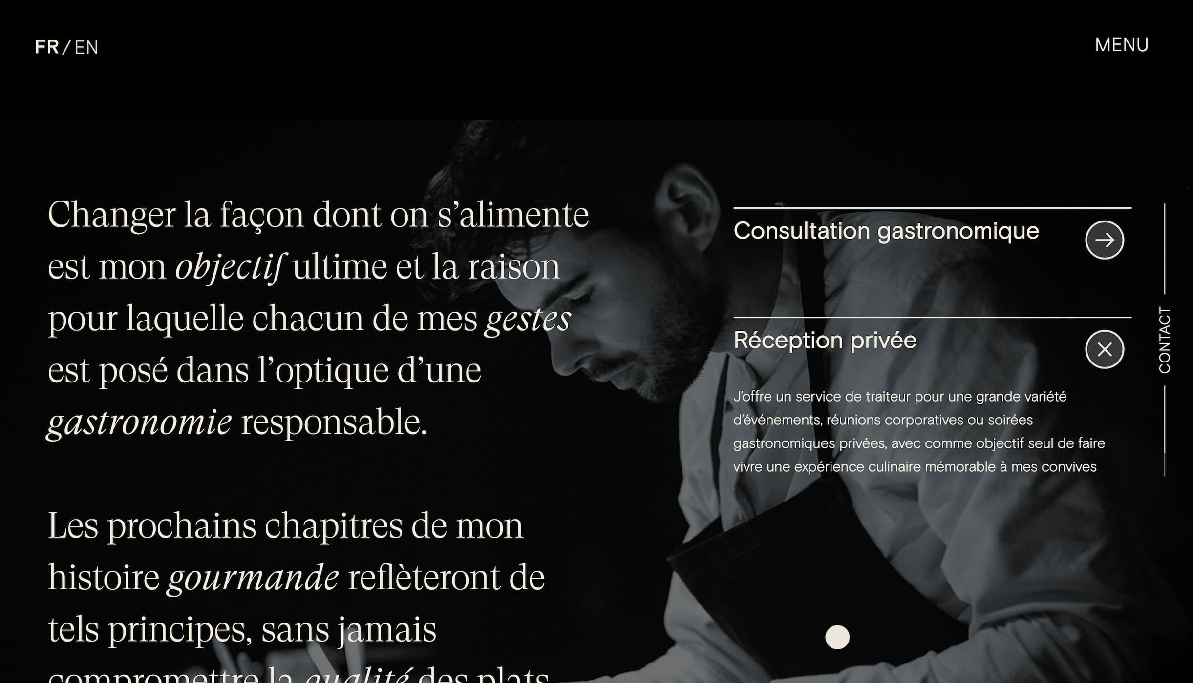 Suite à son passage à l'émission Top Chef Canada, l'ancien chef de cuisine du restaurant Le Mousso, Francis Blais, a sollicité mes services pour la conception et développement web de sa vitrine web. L’interface conçu met de l’avant sa maîtrise de l'art culinaire et fait office de carte d’affaire pour ses investisseurs potentiels.